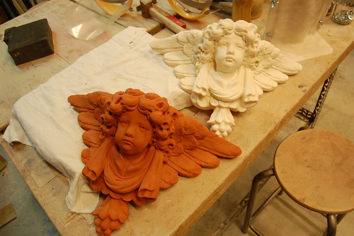 réflexion du monde, choix des matériaux de moulage en fonction des matériaux de reproduction et des quantités souhaitées, étude du plan de joint, construction des portées, pose des produits en membrane et en chapes, finitions, études des diverses possibilités de coulées pour la reproduction des éléments, sortie des éléments de duplication du moule, préparation aux patines et peintures de finitions.